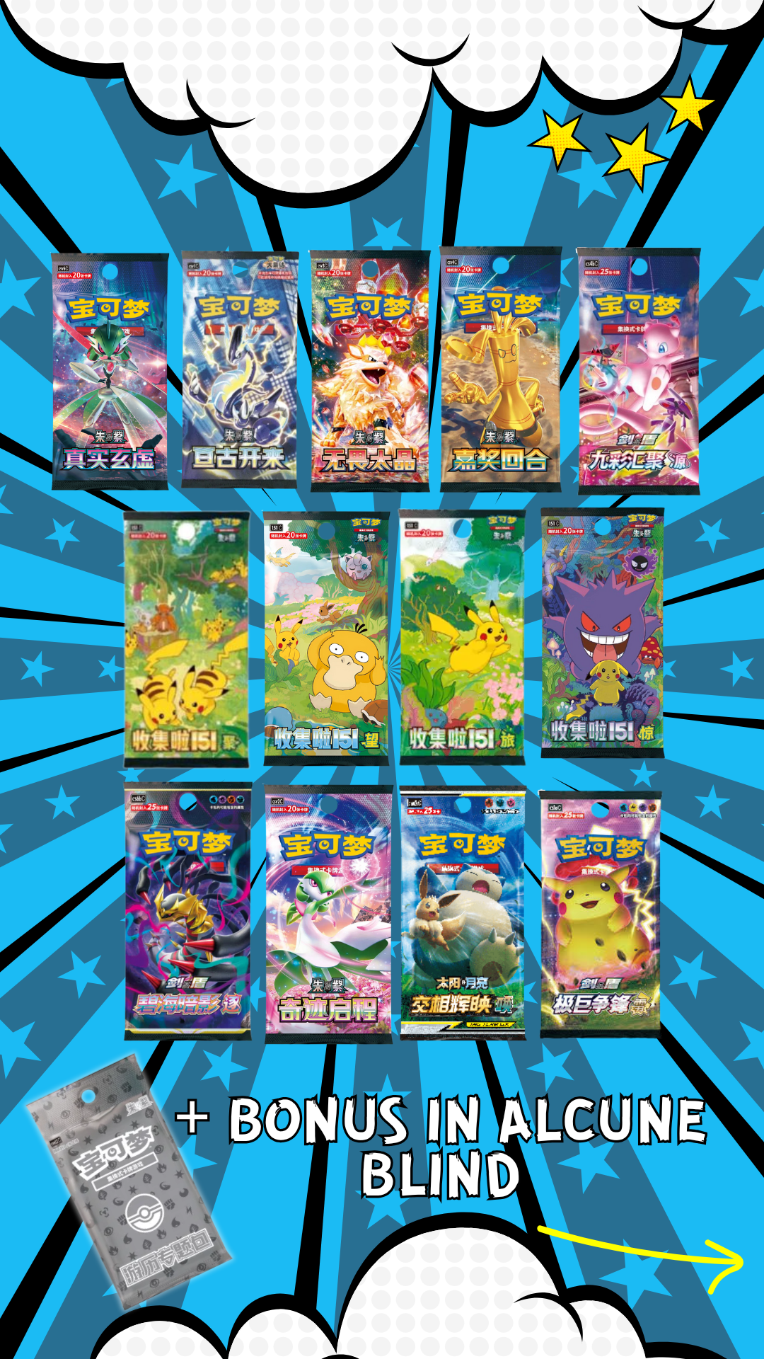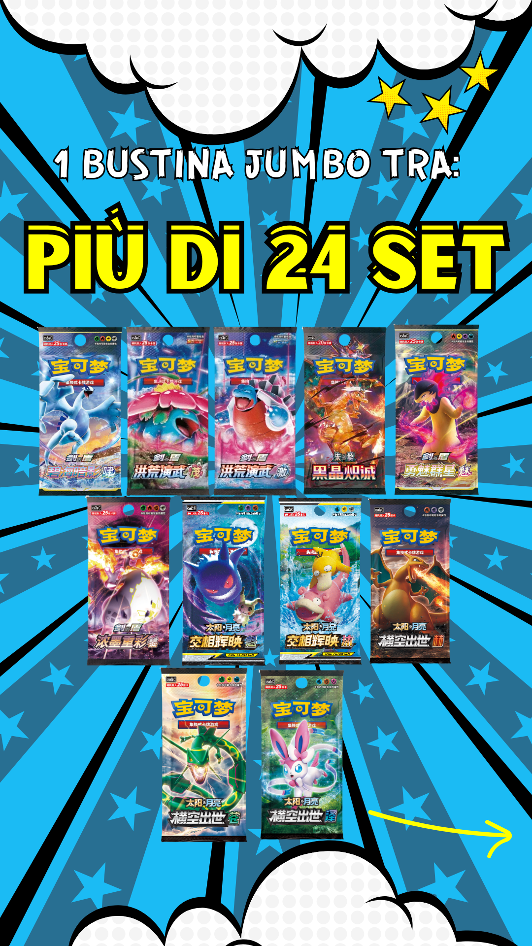 - 1 Bustina JUMBO tra: CSV6, CSV5, CSV4, CSV3, CSV2, CSV1, 151 Surprise, 151 Hope, 151 Journey, 151 Gathering, CS6A, CS6B, CS5A, CS4B, CS3A, CS3B, CS2A, CS1A, CSM1A, CSM1B, CSM1C, CSM2A, CSM2B, CSM2C.